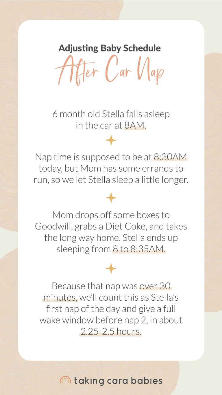 If the car nap is 30 minutes or longer, this will count as their full nap, and that’s okay! (Feel free to extend this nap if you can by treating yourself to the Starbucks drive thru, taking the long way home, or scrolling social media in the parking lot.) After your little one wakes, offer a full wake window before the next nap or bedtime.
